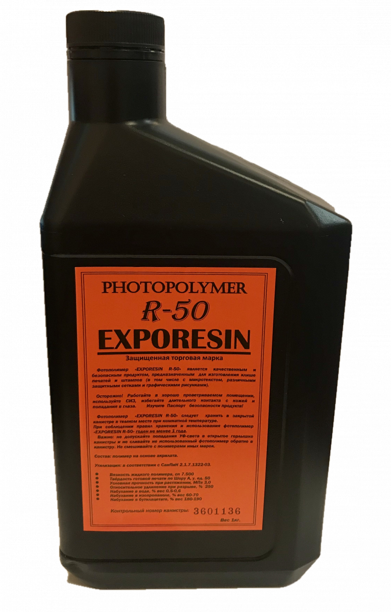 Полимер R-50 является универсальным и самым распространенным фотополимером для изготовления печатей, штампов и факсимиле. При использовании в изготовлении полимера R-50 клише получается эластичным и устойчивым к деформации. Данный фотополимер продается в бутылках весом 1 кг.